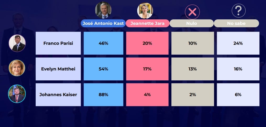 En el detalle sobre el origen de los apoyos, Kast sería el receptor de la mayoría de los votos que respaldaron a Franco Parisi, con un 46%. Similar situación ocurriría con los votos de Evelyn Matthei (54%) y Johannes Kaiser (88%).