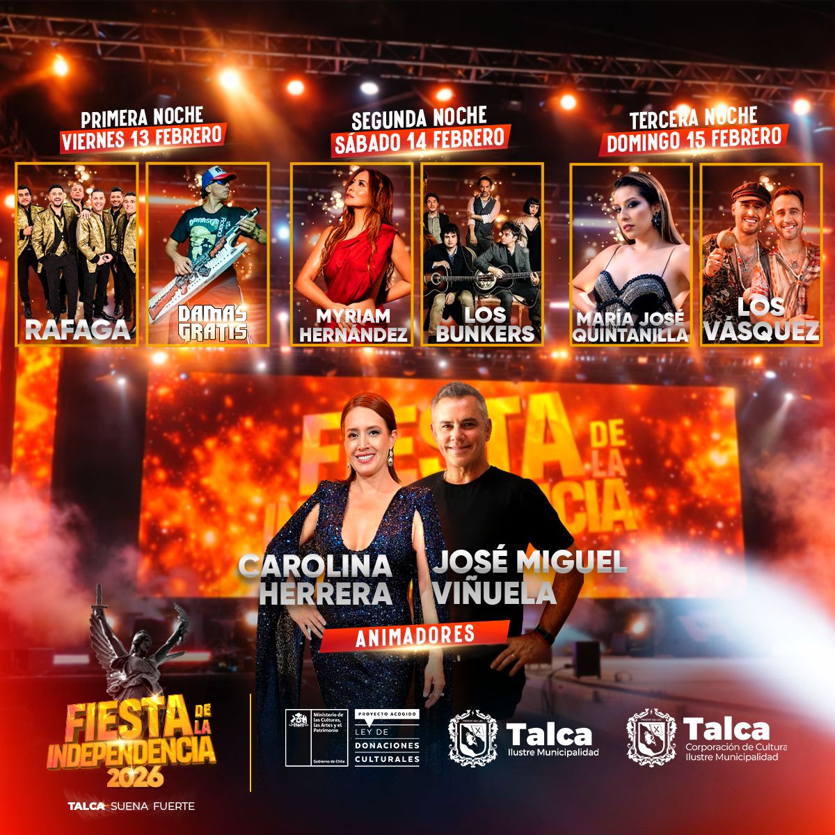 Durante el lanzamiento se dio a conocer la parrilla artística oficial por día de la Fiesta de la Independencia 2026, que se desarrollará en el Parque Río Claro de Talca. El viernes 13 de febrero, a las 22:00 horas, se presentará Ráfaga, seguido por Damas Gratis a las 23:30 horas. El sábado 14 de febrero, la música comenzará a las 21:30 horas con Myriam Hernández y continuará a las 23:30 horas con Los Bunkers. Finalmente, el domingo 15 de febrero, el escenario recibirá a María José Quintanilla a las 22:00 horas y a Los Vásquez a las 23:30 horas, cerrando tres noches pensadas para disfrutar en familia y con amigos.
