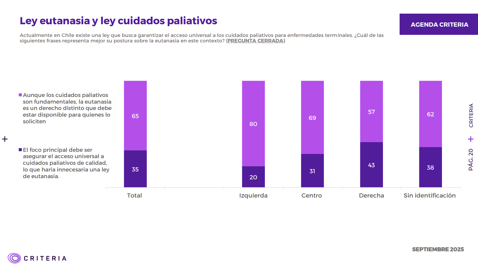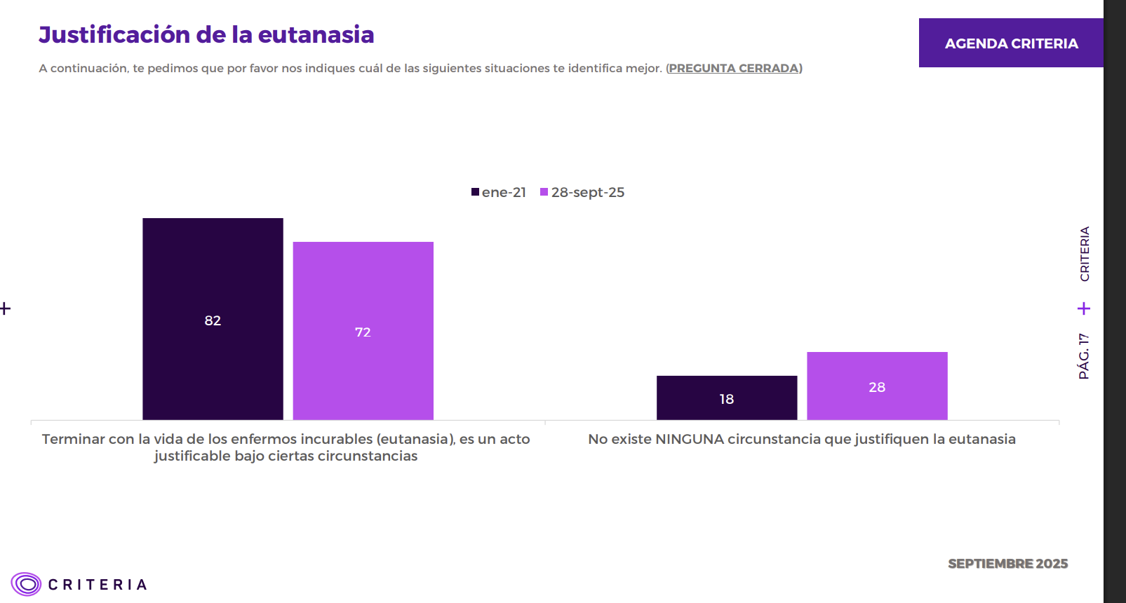 En la última edición de la Encuesta Criteria, correspondiente a septiembre de 2025, se reveló que el respaldo a la eutanasia ha caído en 10 puntos porcentuales en comparación con años anteriores. No obstante, el apoyo continúa siendo mayoritario.