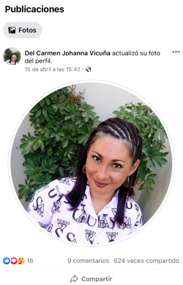 La cuenta está bajo el nombre "Del Carmen Johanna Vicuña", junto a una fotografía de Johanna.