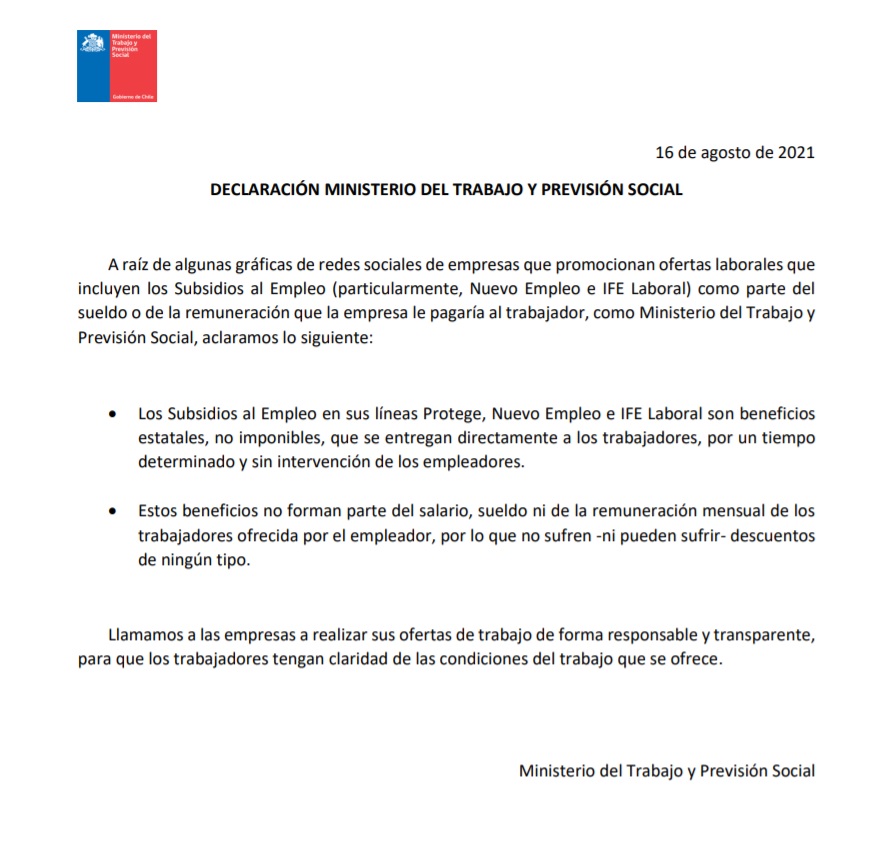 Ante la publicación de algunas empresas que ofrecen puestos de trabajo contemplando los bonos entregados por el Gobierno, entre el suelo que recibirá, el Ministerio del Trabajo y Previsión Social, aclaró que este dinero se entrega "directamente a los trabajadores".