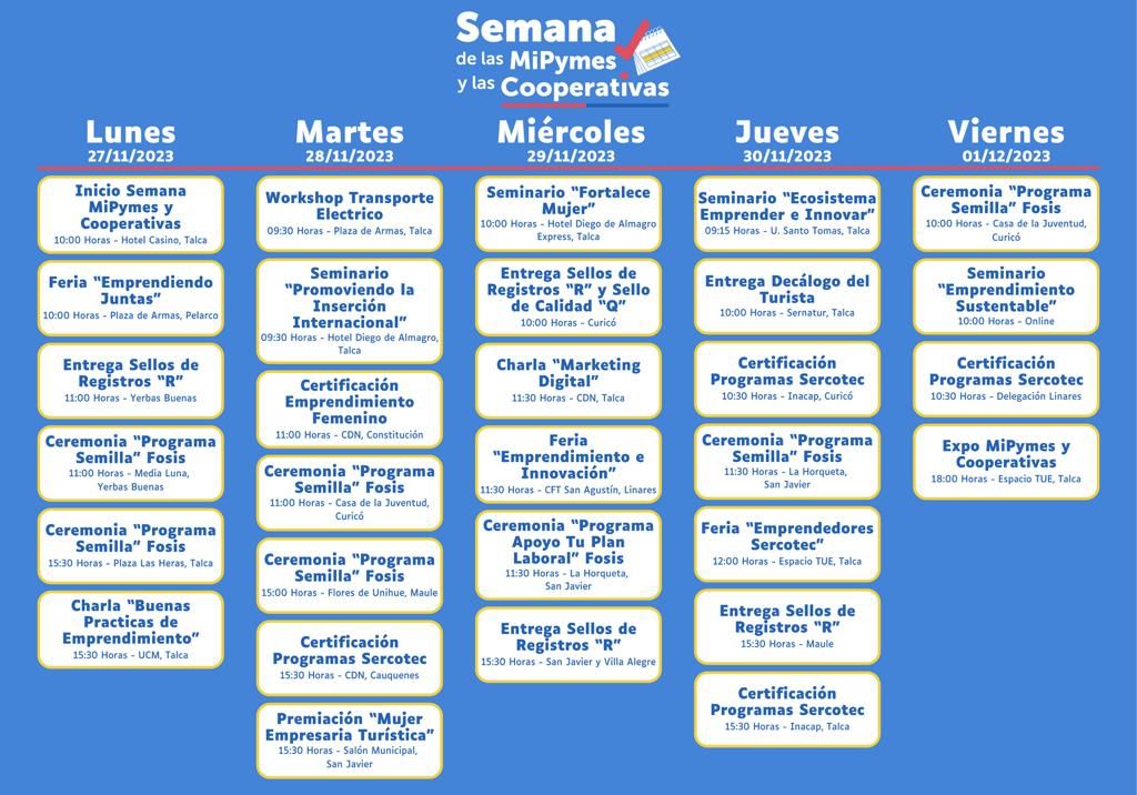Para más información sobre las actividades que se realizarán en la región del Maule desde el 27 de noviembre al 1 de diciembre, puedes ingresar al sitio web www.semanadelapyme.cl.