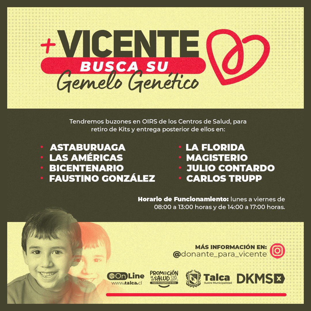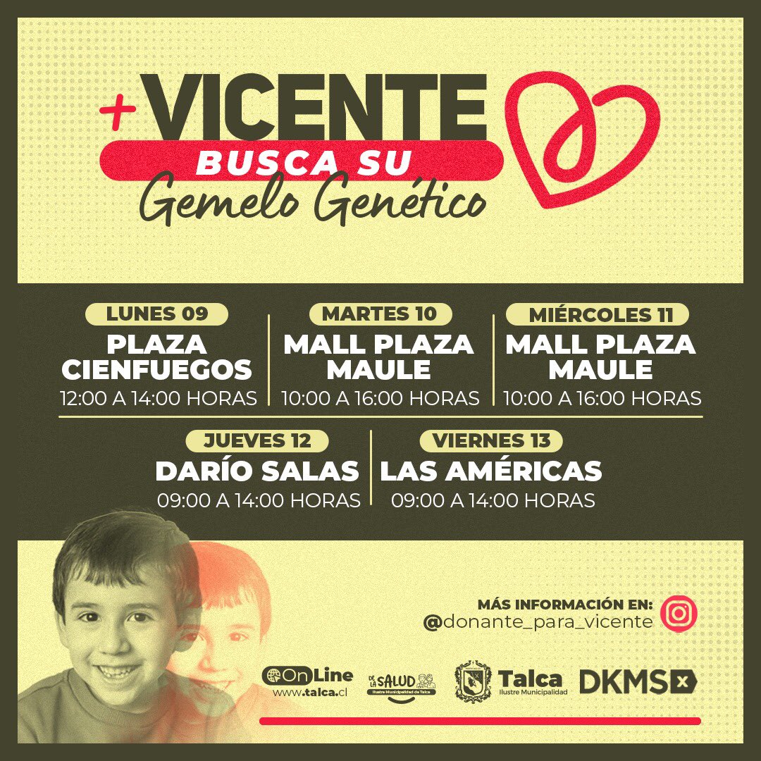 Desde este lunes 9 de agosto y hasta el 03 de septiembre, la Municipalidad de Talca impulsará una campaña, en conjunto con la fundación DKMS.cl para buscar un gemelo genético al pequeño Vicente.