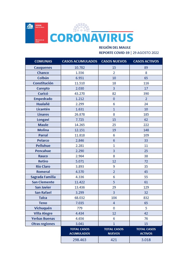 En un nuevo informe sobre la situación del Covid-19 en el Maule, desde la Seremi de Salud expusieron que en las últimas horas se registraron 421 casos nuevos de COVID-19, de los cuales, 322 son personas sintomáticas y 51 asintomáticos. Asimismo, del total de casos nuevos, 150 fueron confirmados mediante test de antígeno y 183 fueron pesquisados a través de búsqueda activa.