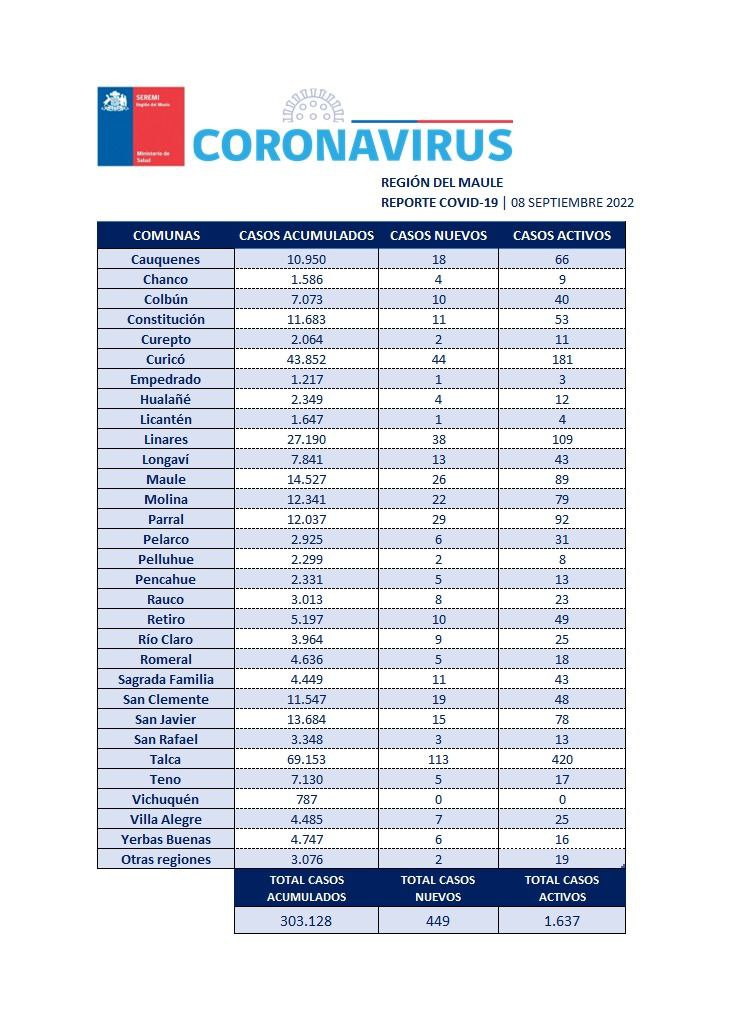 Región del Maule registró 449 nuevos casos de Covid-19