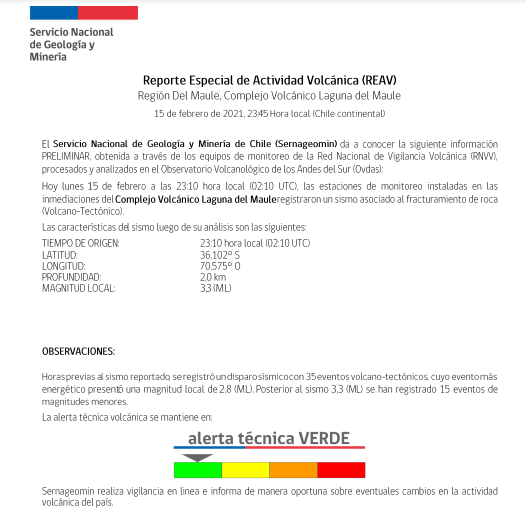 Sernageomin reporta sismo y mantiene alerta verde en Complejo Volcánico Laguna del Maule