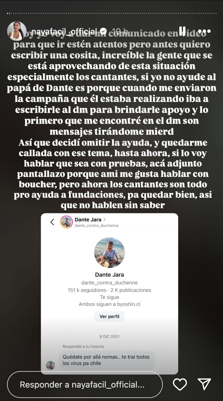 Jara argumentó que su mensaje hacía referencia a que Naya había viajado sin contar con las vacunas requeridas, lo que le impedía regresar a Chile. "Lo único que le dije fue 'quédate por allá, no traigas los virus a Chile'. Tal cual, sin insultos ni groserías", aseguró.